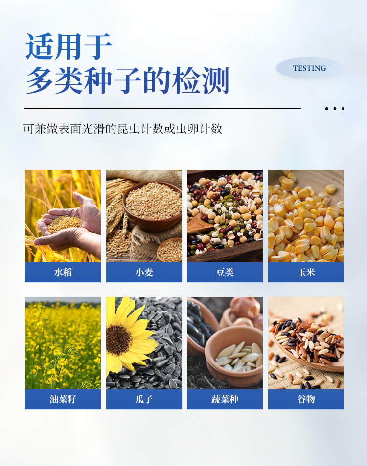 用于各类农作物实粒种子(谷粒、玉米、小麦、油菜籽等)的精确考种,各类粮库的虫口计数分析。可兼做表面光滑的昆虫计数或虫卵计数(如:米象、蚜虫、蚕卵、鱼籽等),以及被当作种子净度工作台用于种子净度检验。
