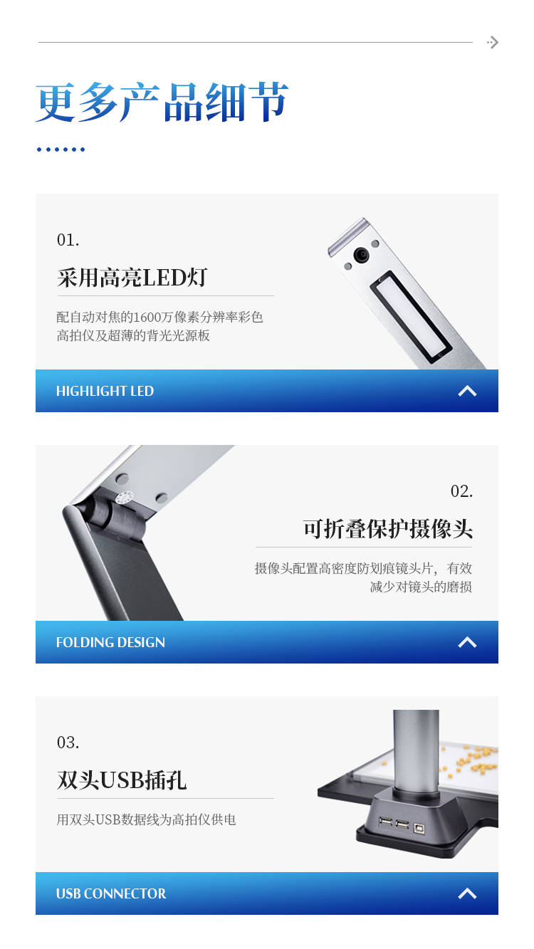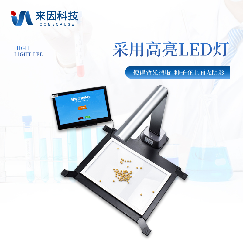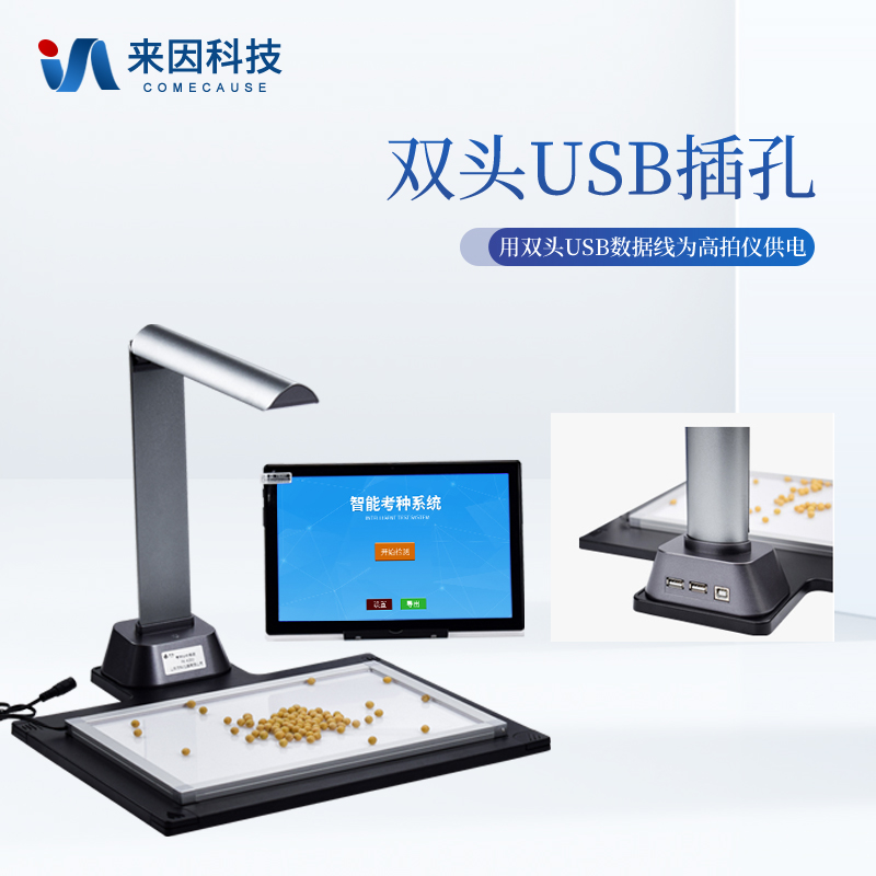 智能考种系统由三部分组成:1600万高拍仪、背光装置和装有嵌入式软件的平板。背光装置采用的是高亮LED灯,外边框使用铝合金材质制成。软件采用先进的图像处理技术,根据距离变换原理、形态学、凸包检测等技术综合设计的一款嵌入式软件。该设备主要应用在农业领域的田间作物测产及考种等方面,通过高拍仪拍摄的照片,软件自动计算种子数量,种子的面积、周长、长度、宽度、长宽比等数据,根据天平所得的重量与种子的数量自动计算出千粒重;以列表和图形的方式输出结果,便于用户查看与分析研究。本产品也可以手动对作物种子数量修正以确保计数精度、对数据进行保存,并且可以查看数据报表,zui后可以将数据以Excel格式导出,或者通过WiFi数据上传到仪器云农业数据中心平台系统从而实现数据统计,分析智能化。