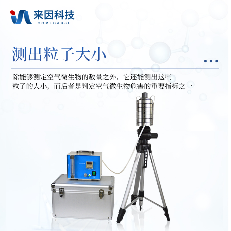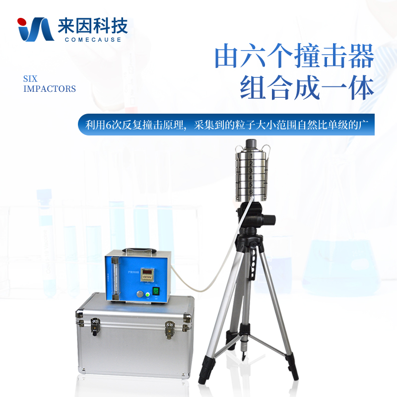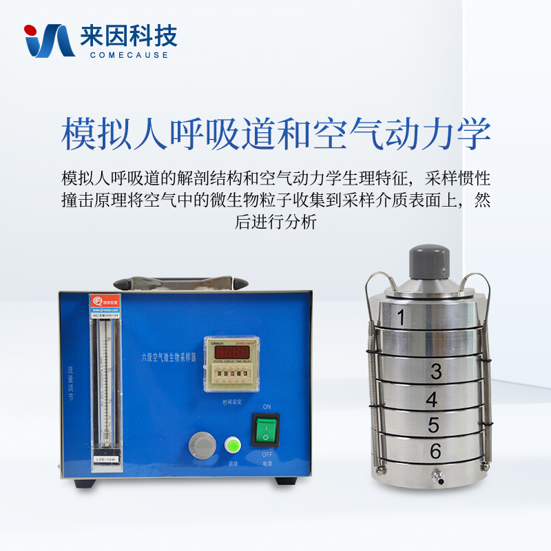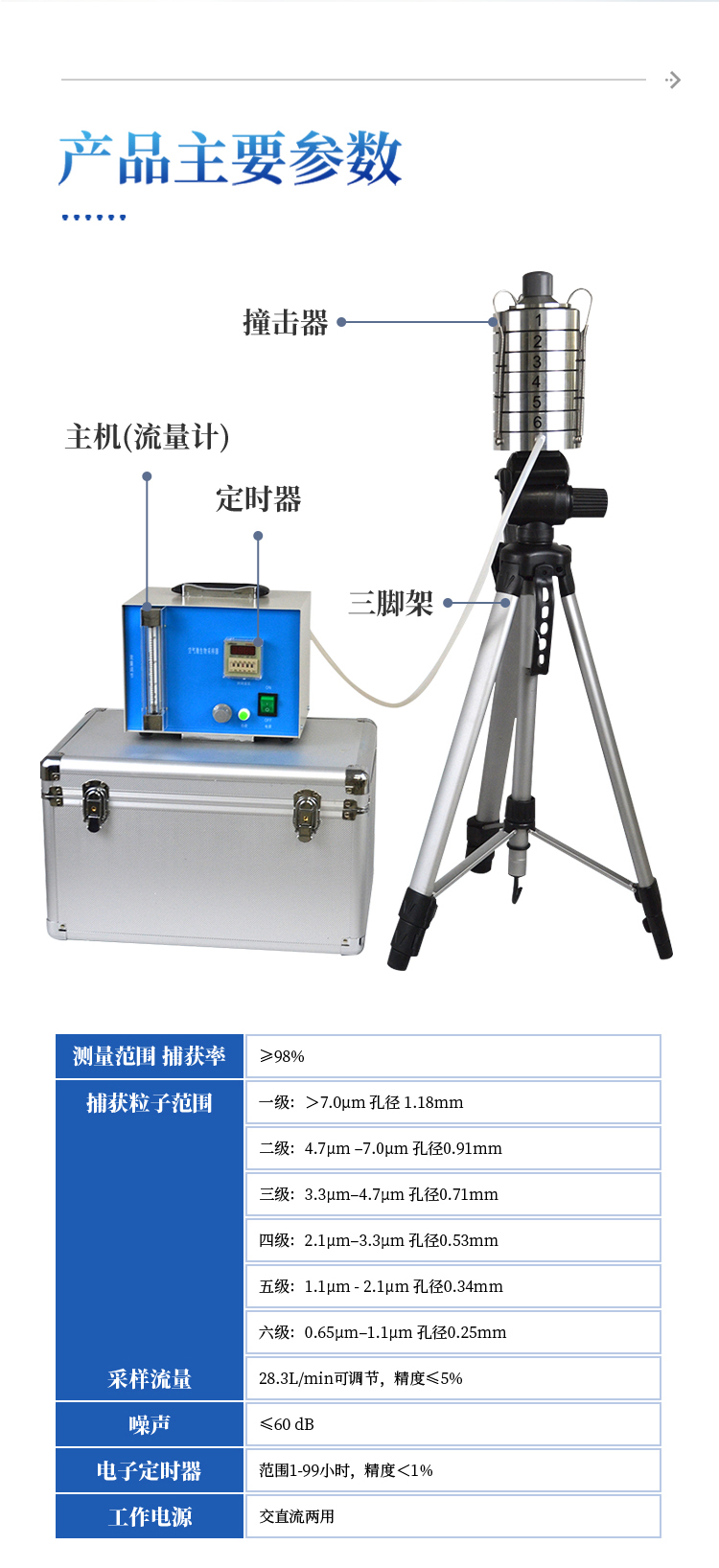 整个仪器是由撞击器、主机(流量计)、定时器、三脚架组成。撞击器是6层有微小孔眼的铝合金圆盘。圆盘下放琼脂平皿,每圆盘间有密封胶圈,在通过三个弹簧挂 钩把圆盘牢固地联在一起。每个圆盘上有400个成环行排列、逐层减小、尺寸精确的小孔,标准采样流量为1立方呎(28.3L/min)。当含有微生物粒子 的气流进入最上层的采样口后,由于气流的逐层增高,不同大小的微生物粒子按空气动力学特征分别撞击在相应的琼脂表面上。捕获在各级上的粒子大小范围是由该 级孔眼的气流速度和上一级的粒子截阻率而决定的。第1、2级类似人的上呼吸道捕获的粒子,第3~6级类似人的下呼吸道捕获的粒子,这就相当程度上复制了这 些粒子在呼吸道的穿透作用和沉着部位。