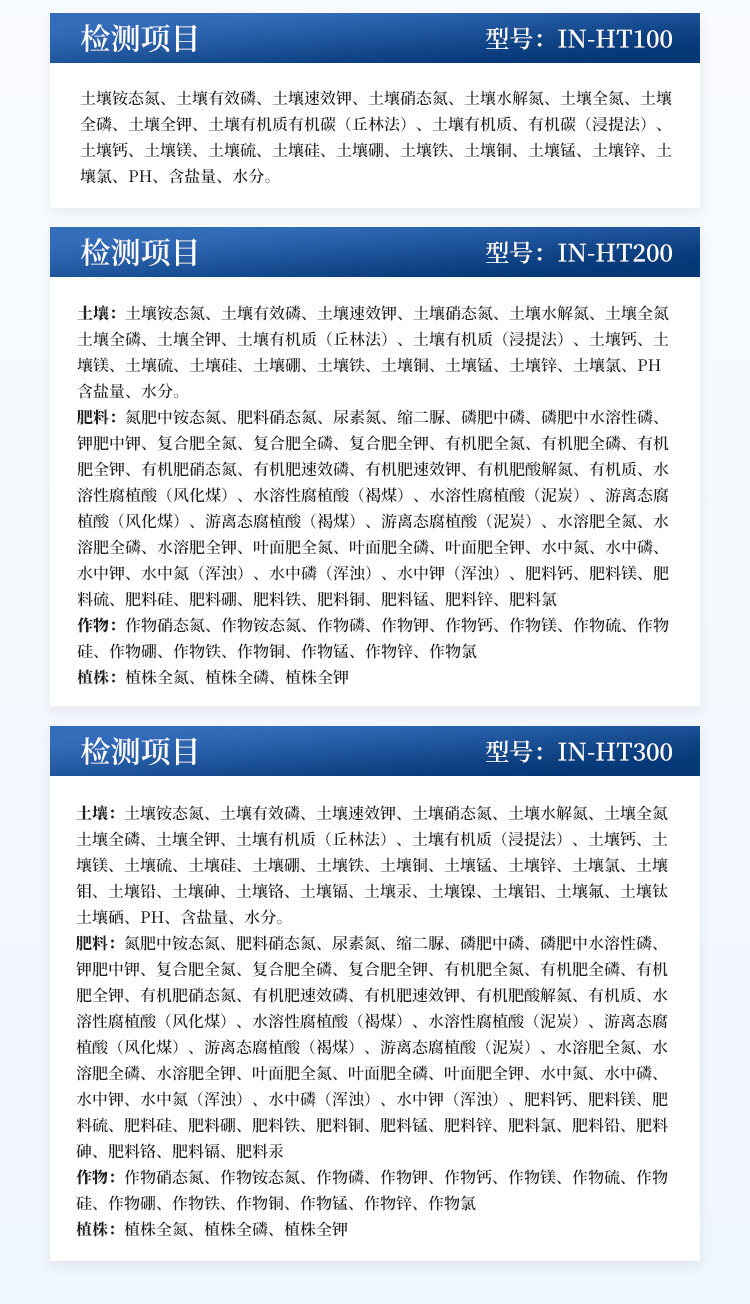 土壤:土壤铵态氮、土壤有效磷、土壤速效钾、土壤硝态氮、土壤水解氮、土壤全氮、土壤全磷、土壤全钾、土壤有机质(丘林法)、土壤有机质(浸提法)、土壤钙、土壤镁、土壤硫、土壤硅、土壤硼、土壤铁、土壤铜、土壤锰、土壤锌、土壤氯、土壤钼、土壤铅、土壤砷、土壤铬、土壤镉、土壤汞、土壤镍、土壤铝、土壤氟、土壤钛、土壤硒、PH、含盐量、水分。