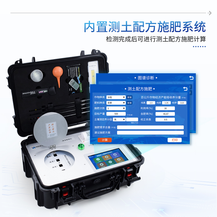 16.内置测土配方施肥系统,检测完成后可直接进行测土配方施肥计算;同时具有单独配方施肥计算模块;仪器内置百余种常见经济作物标准养分值,内置施肥校正系数,可对目标产量计算施肥量,以此指导农业生产;测土配方施肥结果可打印,打印内容包含作物种类、肥料种类、目标产量、需求总量、建议施肥方案。