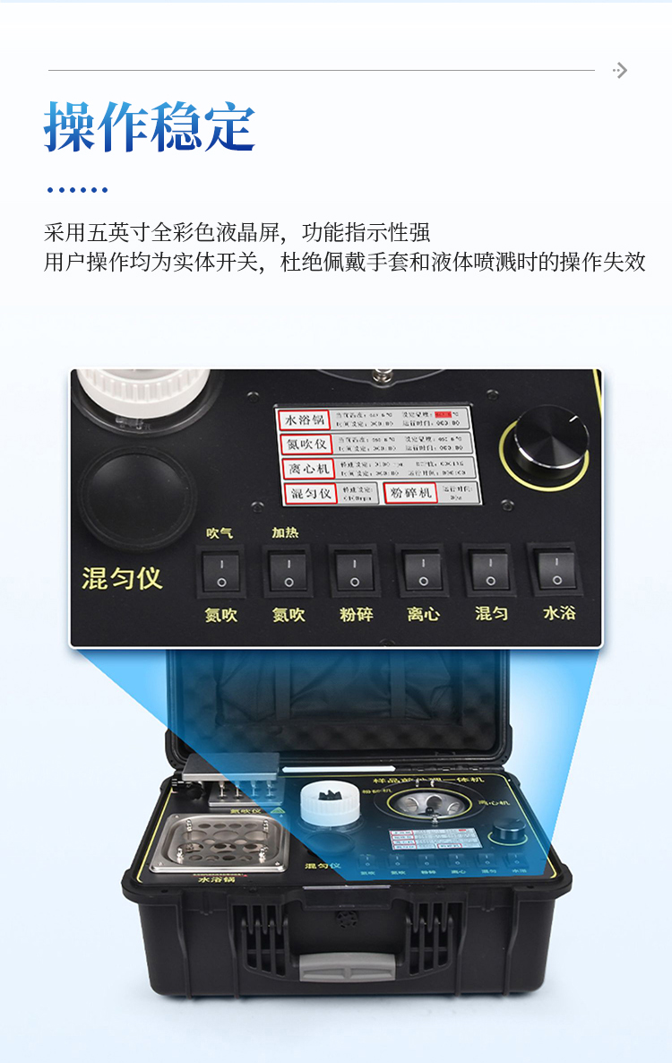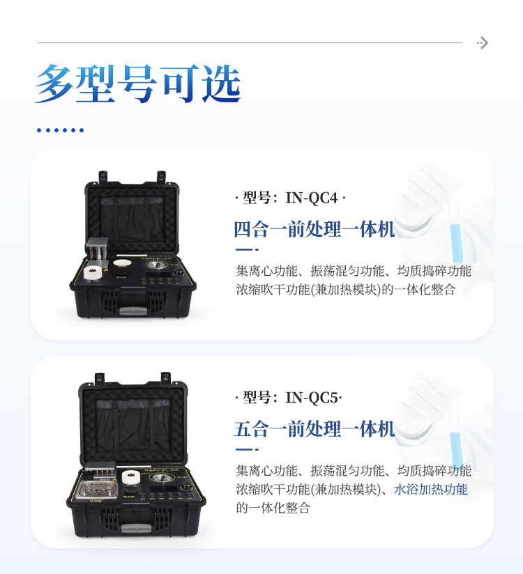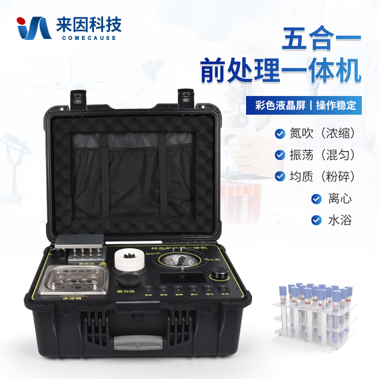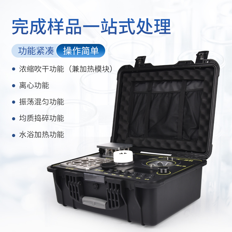 应国内用户的实际需求,自行研制开发的新型仪器——QC5型样品前处理一体机。样品前处理集成箱将样本前处理过程中样品浓缩、水浴恒温、离心分层、均质、振荡混匀等步骤所需设备进行集成,仅需一台样品前处理集成箱设备即可完成所有样本前处理过程,并且方便携带,不仅适用于现场检测使用,还可用于色谱、质谱等分析样品的纯化和制备。