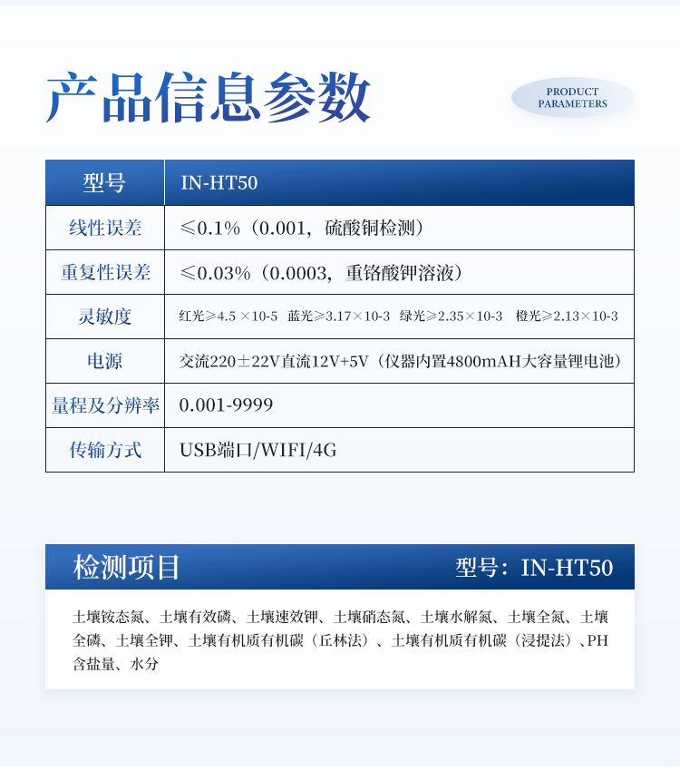 检测速度:在正常熟练程度下,测土壤铵态氮、磷、钾三项要20分钟(含土样前处理及药剂准备),微量元素单项检测需20分钟左右。