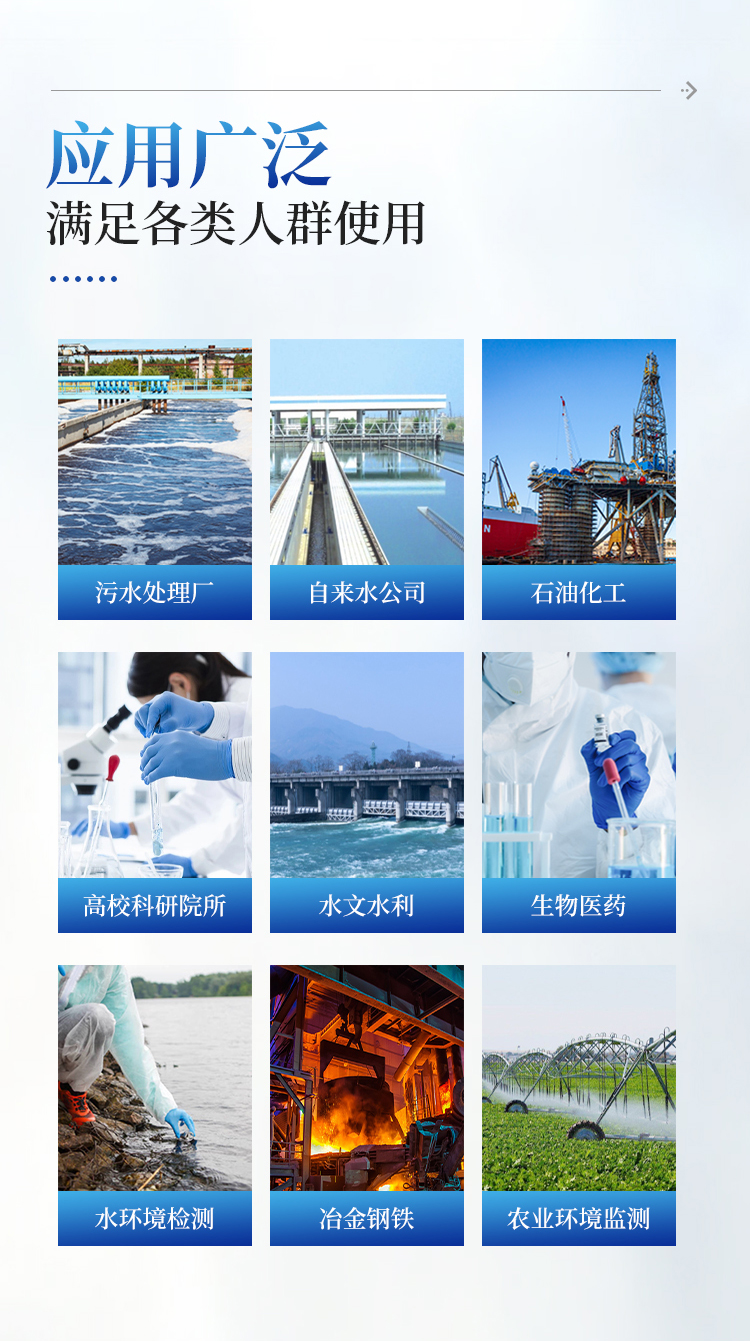 可广泛应用于水环境检测系统、污水处理厂、自来水公司、石油化工、高校科研院所、水文水利、冶金钢铁、生物医药、农业环境监测、毛纺印染、海洋环境监测、造纸、医药、农业科技、海洋运输等领域。