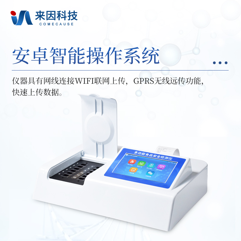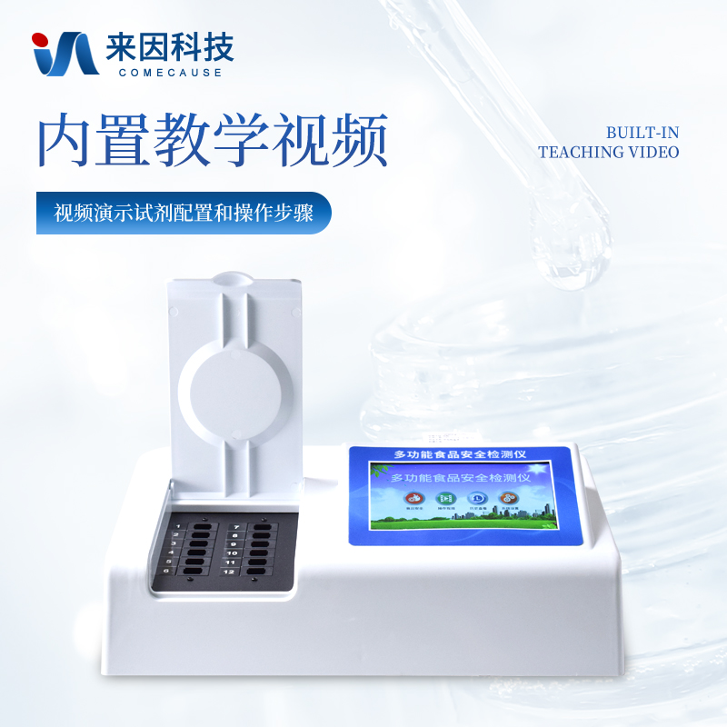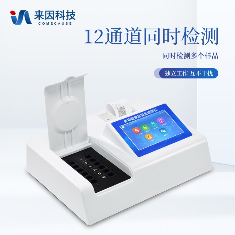 可快速检测各类食品中的甲醛、吊白块、二氧化硫、亚硝酸盐、双氧水、硼砂、农药残留、乳及乳制品中蛋白质、硝酸盐、重金属铅的含量,仪器预留其他项目检测程序和端口,根据日后需求可方便的自主增加检测项目。