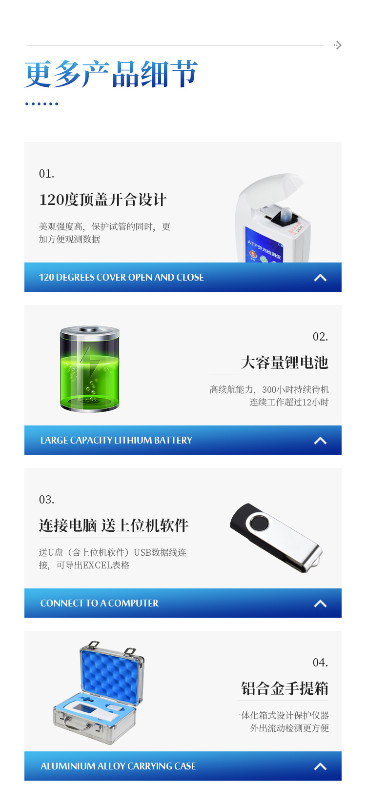 该设备为全新升级产品,安卓智能操作系统。操作采用生物化学反应方法检测ATP含量,ATP荧光检测仪基于萤火虫发光原理,利用“荧光素酶—荧光素体系”快速检测三磷酸腺苷(ATP)。ATP拭子含有可以裂解细胞膜的试剂,能将细胞内ATP释放出来,与试剂中含有的特异性酶发生反应,产生光,再用荧光照度计检测发光值,微生物的数量与发光值成正比,由于所有生物活细胞中含有恒量的ATP,所以ATP含量可以清晰地表明样品中微生物与其他生物残余的多少,用于判断卫生状况。
