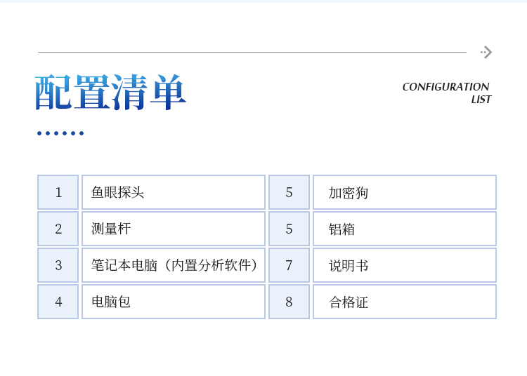 8. 配置清单:鱼眼探头、测量杆、笔记本电脑(内置分析软件)、电脑包、加密狗、铝箱、说明书,合格证